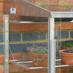 Supplied complete with seed tray shelves – the 4ft long model one wide and one narrow seed tray shelf, the 6ft long model two wide and two narrow shelves. These shelves are height adjustable or can be removed or dropped flat when not required. The slim aluminium bars which form these shelves do not block much light from plants below.