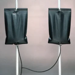 Three 2 gallon water reservoir bags with fittings to hang them from an aluminium greenhouse glazing bar – each bag holds sufficient water for 24 hours.