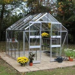 Framework including integral base – manufactured from sturdy, maintenance free aluminium. The integral aluminium base enhances ease of construction enabling the whole frame to be simply bolted together and secured down. The 4′ wide double door has been dropped into the aluminium base providing a zero level threshold allowing un hindered access for the user. Also the inner face of the ridge bar has the unique feature of having the glazing channel that accepts cropped bolts and other fixings allowing you to fit accessories high up in the centre of your greenhouse.