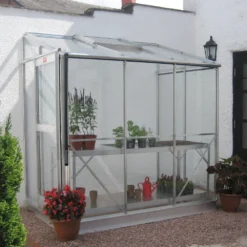 – access is via the 2′ (600mm) wide & 5’3″ (1600mm) high single sliding door, which can be fitted to either end of the lean-to during assembly.ÂDiamond Shelving – made from extruded aluminium & with the same finish as the lean-to, you receive sufficient to fit down the length of the lean-to. It is two slats wide, 7″ / 19cm wide, 8″ / 22cm from the glass.