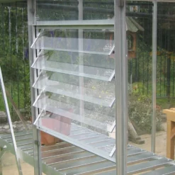 One Five Bladed Louvre with toughened glass – this enhances ventilation in the lean-to. It can be fitted on the length of the lean-to or on the end opposite the door. For maximum air flow fit low down, if possible, opposite the greenhouse door.