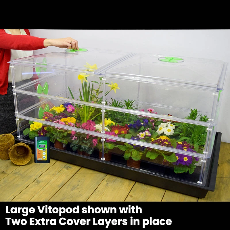 For maximum versatility you can add a Standard Extra Layer onto a Large Vitopod, making it possible to raise new plants whilst at the same time providing a warm area for taller plants to continue to grow.Â