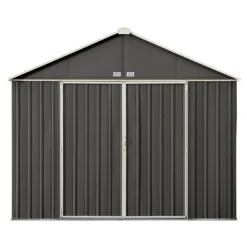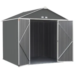 Easy access – is via a single swing door (with the 6 x 5 model) or double swing doors (on the 8 x 7 and 10 x 8 models). Designed specifically to be wider and taller than most shed doors it makes it easier for you to move large, bulky items in and out of your shed. These doors have a heavy duty frame making a durable doorway and each door has three hinges for improved durability. The doors feature pad-lockable handles (padlock not included) and are constructed from steel which have been zinc plated to resist corrosion and rust. Â