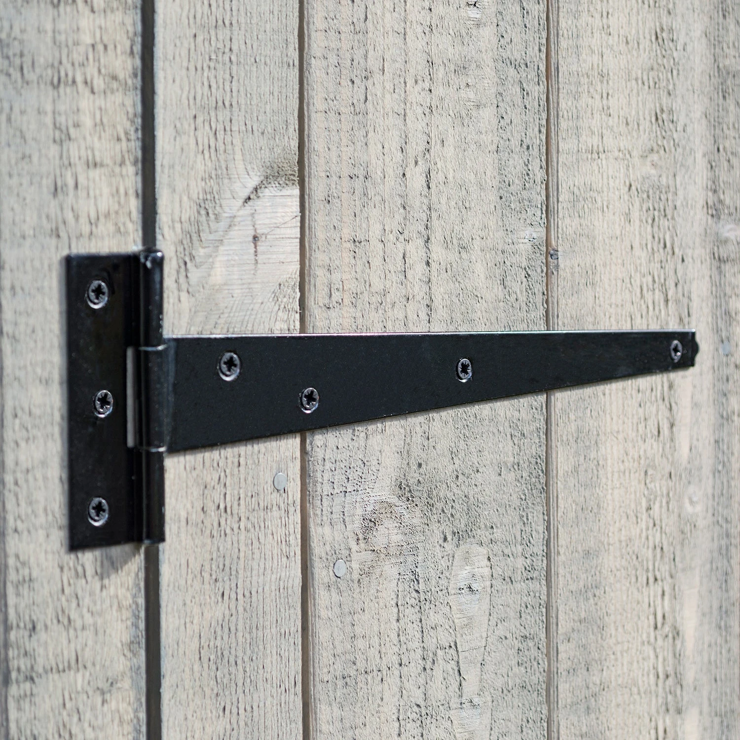 Single Hinged Door – with Z framing for strength and stability. Three large, T-hinges secure the door to the frame of the shed. A pad bolt on the front secures the doors closed – we recommend adding a padlock (not included) for added security. Door opening size : 5ft / 152.5cm high x 2ft 3½in / 69.5cm wide.Â