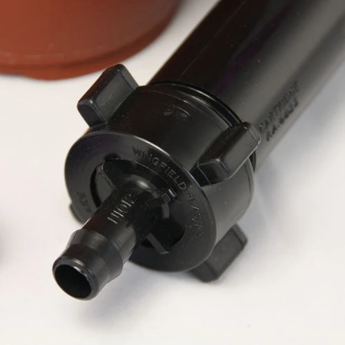 WIth a ˝” barbed fittings at either end of the filter allowing you to securely push ˝” hose/ tubing.