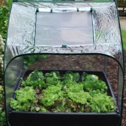 Pop-Up Mini Greenhouse – measuring 3’3″ (1m) square x 3’11” (119cm) high (to the ridge) this sturdy greenhouse fits directly over the Raised Bed to provide instant plant protection.