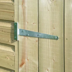 Single Door – with Z framing for added stability. Two large, zinc, T-hinges secure the door to the frame of the shed. A zinc hasp and staple fitting allow you to close the door – we recommend adding a padlock (not included) for added security. Door opening size : 5ft / 152cm high x 2ft 1½in / 64.5cm wide.Â