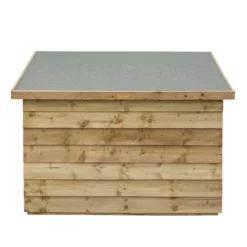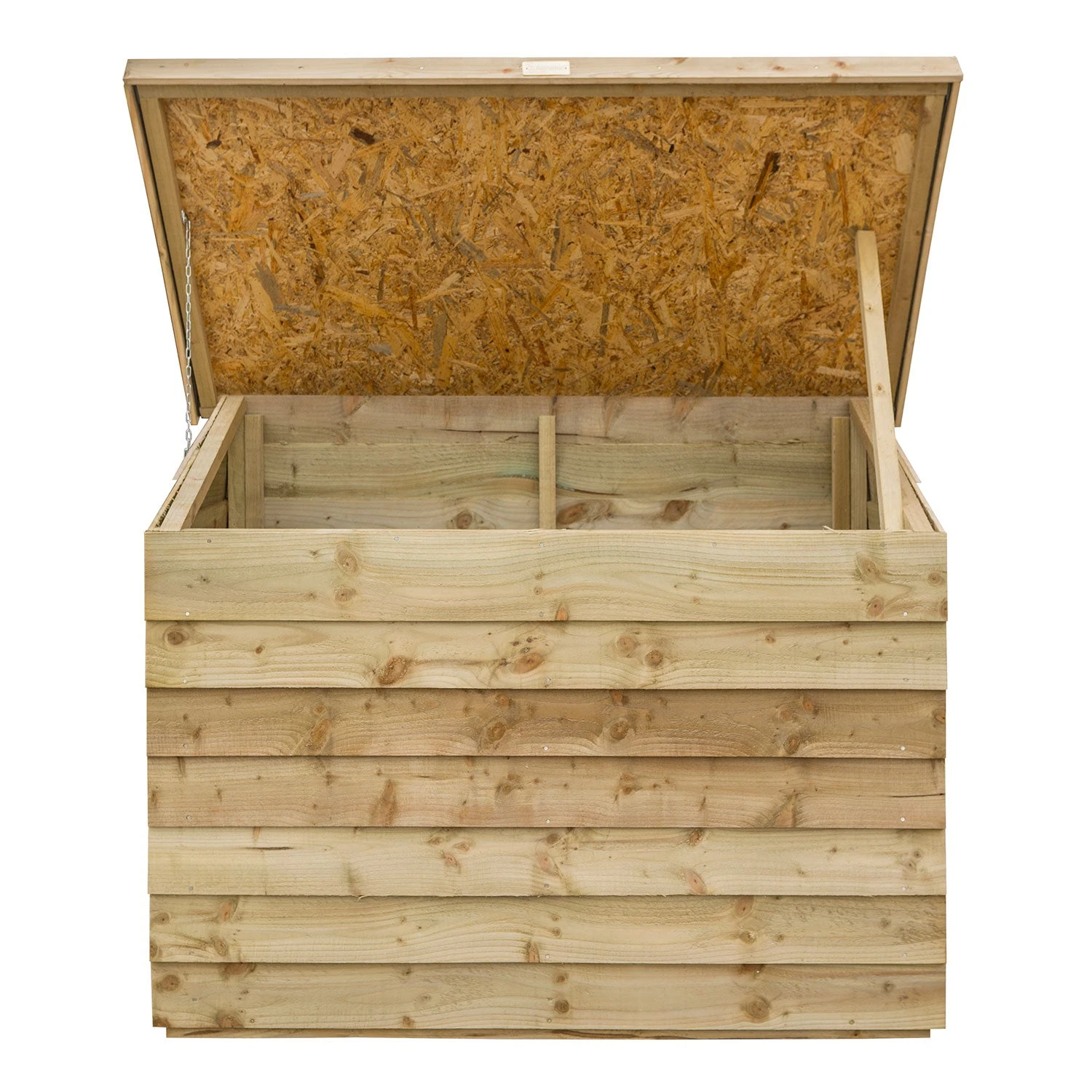 OSB Roof Panel – supplied as one panel to form the complete roof. This is hinged at the back with large T-hinges. A stay bar is included to secure to the inside of the chest and provide a secure support to hold the lid open when required. A chain is included to be attached to the roof to prevent the lid from opening beyond the vertical position.