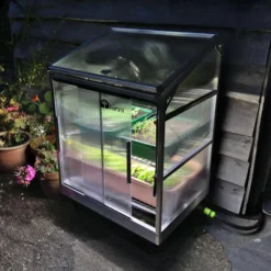 Thermally efficient polycarbonate safety glazing – 4mm thick, this double skinned plastic glazing has an air gap between for effective insulation, helping to keep things warm in the winter and cool in the summer. Glazed on all sides, roof and back, this polycarbonate glazing has good light transmission, giving a soft diffused light which helps to reduce scorching whilst encouraging healthy growth. It is also safe, shatterproof and virtually unbreakable. Being UV protected it has an expected life of at least 10 years.Â